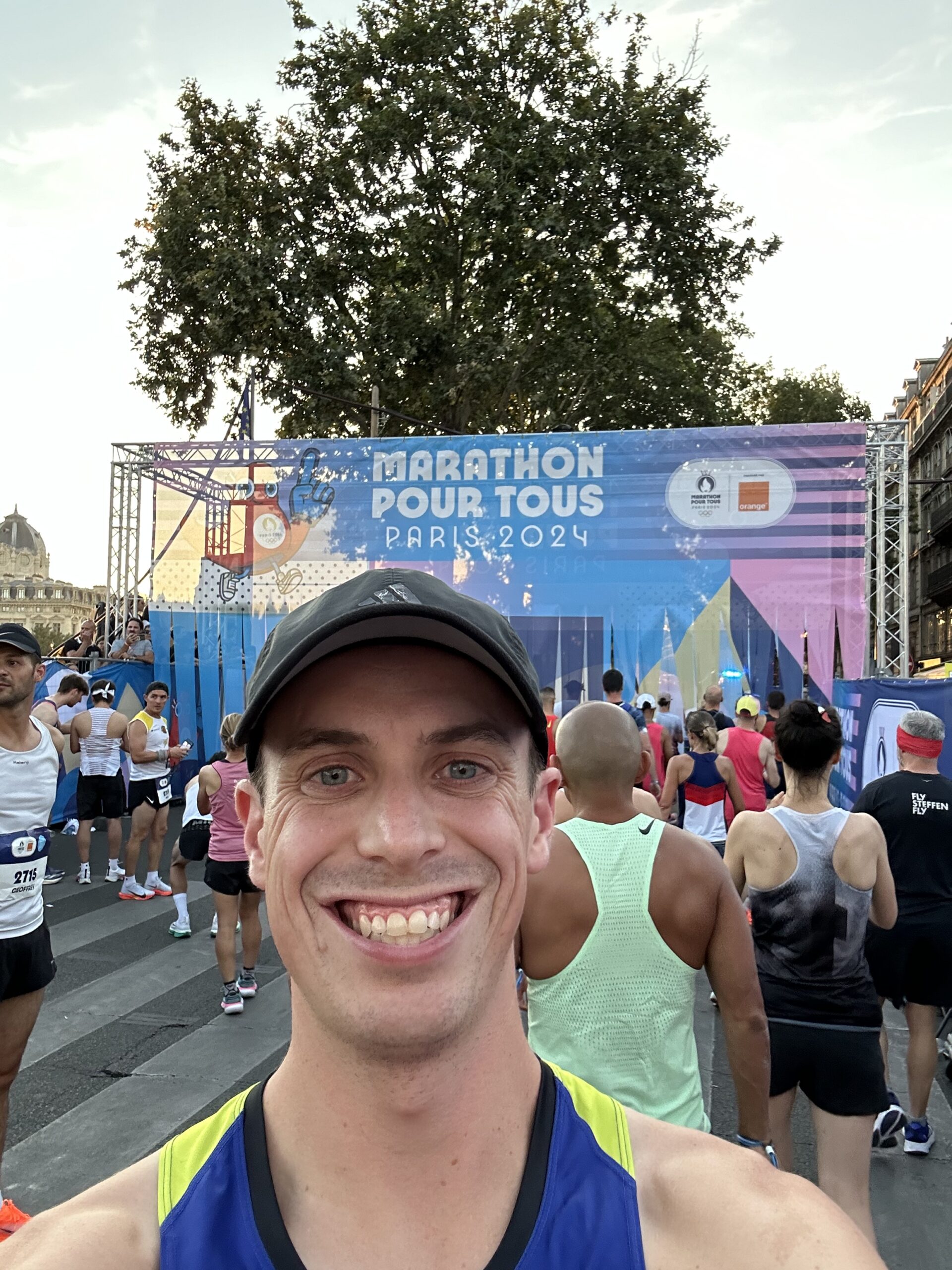 About 10–15 minutes before the 9 p.m. start, the pre-race festivities kicked off with the official Olympic song and the French national anthem. The sun was setting, casting a golden glow over the city—it was a beautiful evening, just a little too warm. And then, we were off.