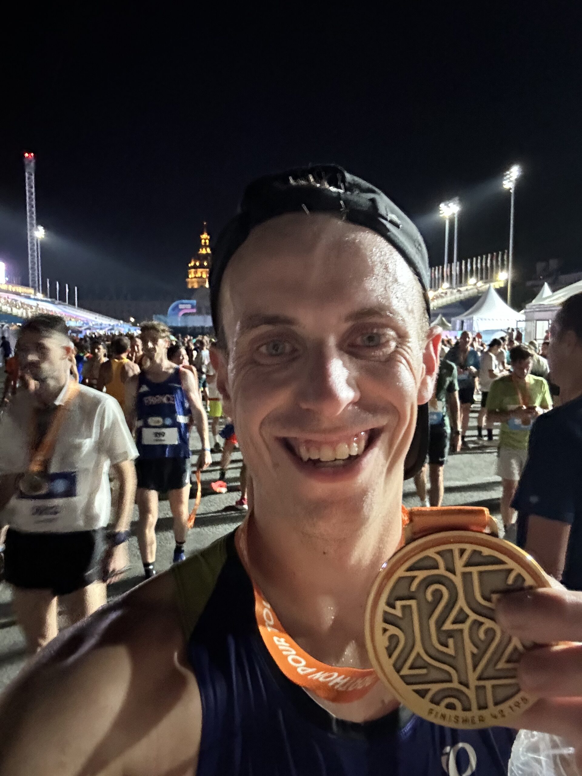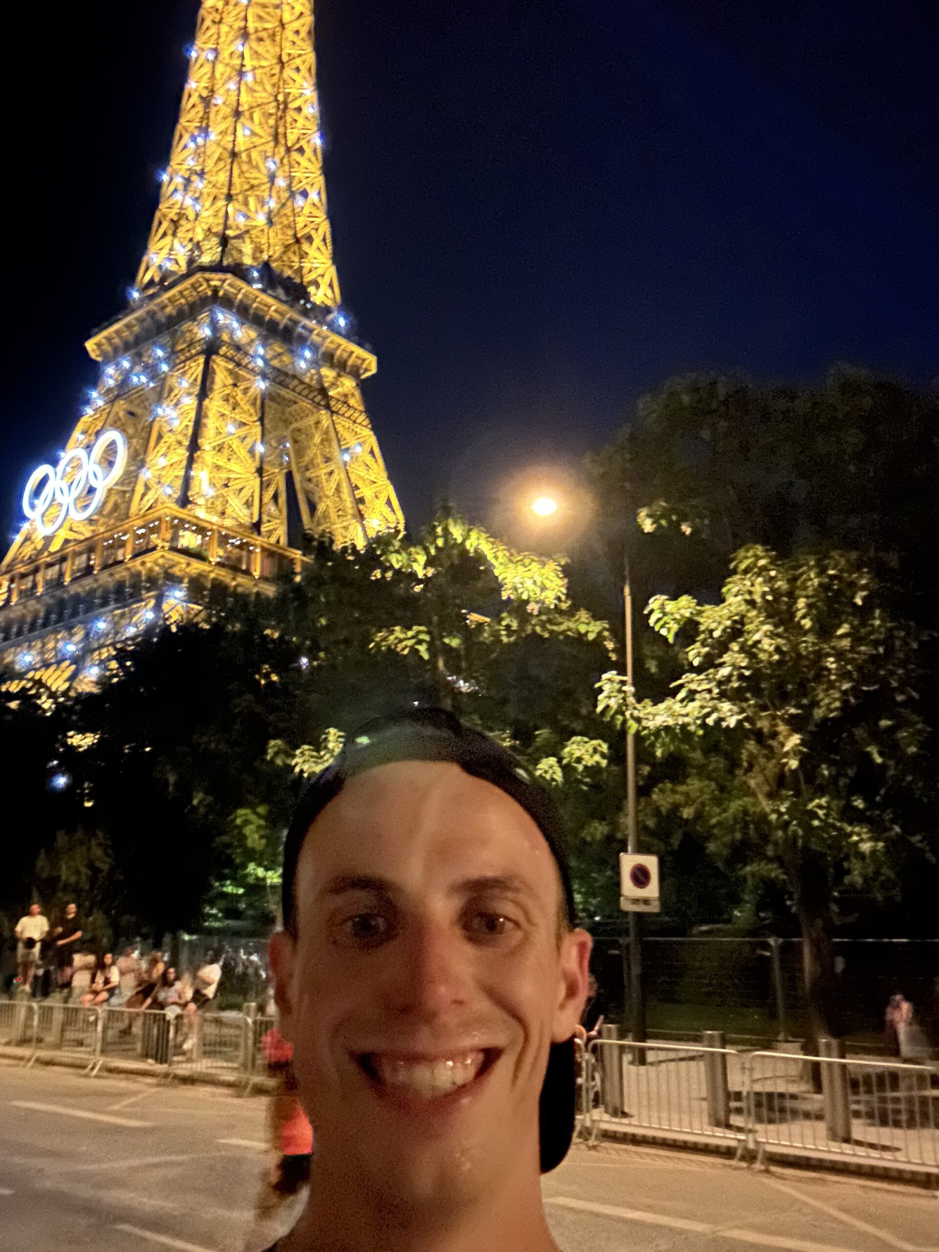 As we got closer to the city center, the crowds thickened and the views came alive again. A long straightaway opened up to a stunning view of the Eiffel Tower, glowing in the distance like a beacon. I hadn’t planned it, but as I passed underneath the sparkling lights, I glanced at my watch—midnight on the dot. It was surreal. I couldn’t resist pulling out my phone for a quick selfie to capture the moment.